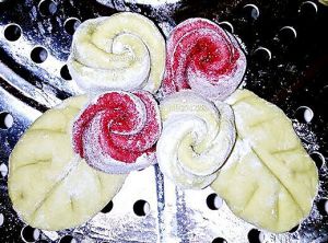 发酵好后开大火把水烧开,看到热气后计时,中火蒸20分钟后关火,焖3分钟后揭锅盖,玫瑰花馒头蒸好了。
