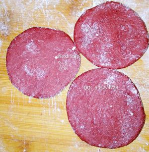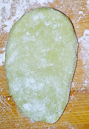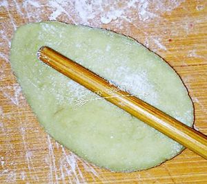 以黄色南瓜面团为例,小剂子搓圆后幹成饺子皮状。