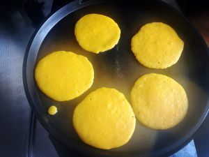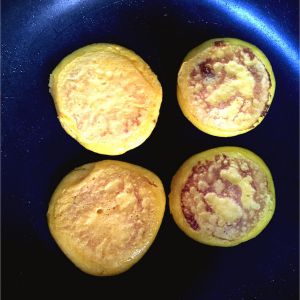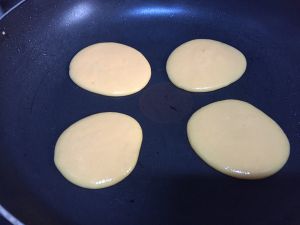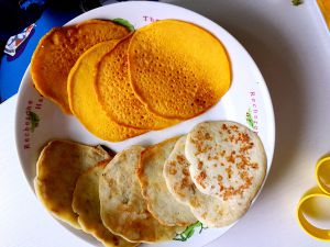 一面熟了,赶紧翻面继续煎至金黄即可出锅!晾凉后给宝宝吃,松软可口香甜,这些量可以做直经4cm左右小饼15个左右!我宝大宝十一个,二宝吃了三个,再喝200的奶饱饱的了