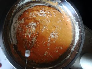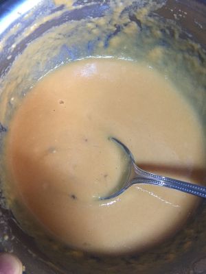 打完如图上样子,之后加入鸡蛋用手动打蛋器打匀,之后加糖,盐,15克黄油,加低粉拌匀,加入100克牛奶,成拉丝的流动性好的糊糊,备用!上锅前忘记拍了,下次䃼上!