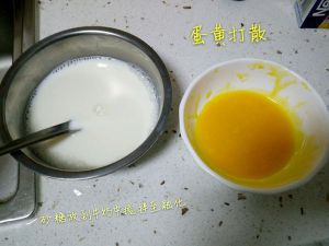 砂糖放到牛奶中搅拌到融化为止~,蛋黄打散,然后蛋黄倒入牛奶液中,再加入奶油拌匀。