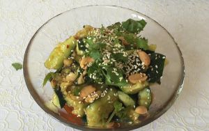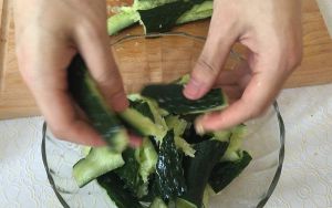 黄瓜洗净,切去瓜头,瓜尾,顺长一切两片。剖面朝刀板,用刀背轻拍使其脆裂,斜切成块。