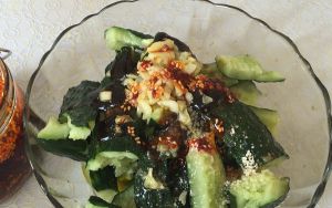 抽空洗根黄瓜用刀拍松切小块,随便撒点儿糖盐入个底味拌两下