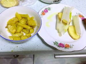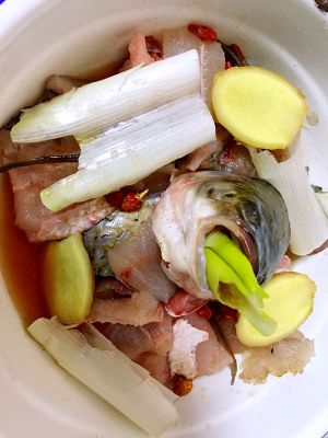 6,把鱼上的葱姜取下来,泡椒切段,泡椒里的水不要倒掉,放在一边,一会用。