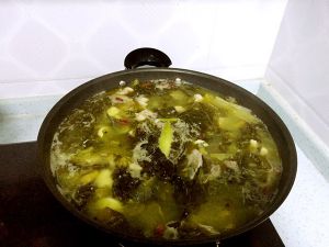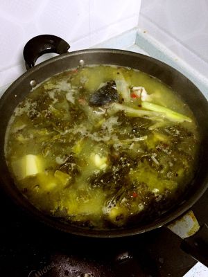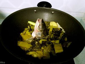 7,葱姜,泡椒干花椒炝锅,然后倒入酸菜翻炒,出香味后倒入鱼头鱼骨翻炒。