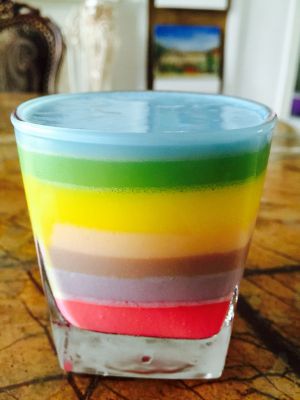 另取一透明玻璃杯子,过筛倒入一种颜色的溶液,放入冰箱冷冻20分钟,杯中液体表面凝固再筛入另一种颜色冰箱冷冻……