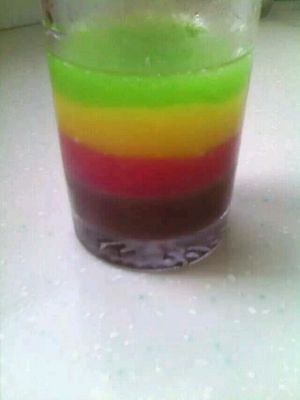 搅拌后放入容器 放冰箱冷藏10分钟左右 等凝固了 一次加入各颜色