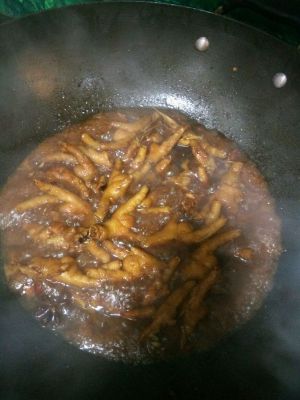 锅里倒入温水放入鸡爪,花椒、大料、姜、肉桂、香叶、冰糖、料酒、味极鲜、老抽、红糖、十三香大火煮开,转小火炖1小时最后把锅盖打开小火收汁
