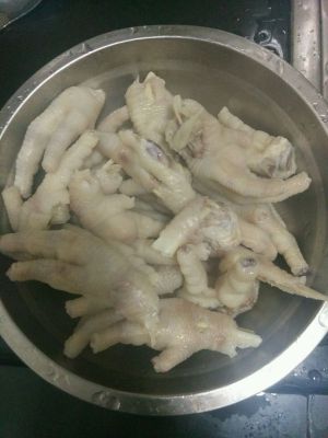 冰冻鸡爪泡水解冻,洗净,准备一只深汤锅倒入足够多的凉水加入适量料酒,鸡爪放入锅里,用大火烧开煮出血沫关火(这一步是为了去腥味),取出鸡爪晾至微凉。