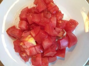 西红柿表面十字花刀,用开水烫一会,皮会自动裂开,剥去外皮,用手掰碎备用。