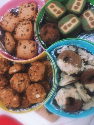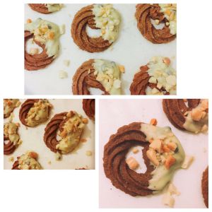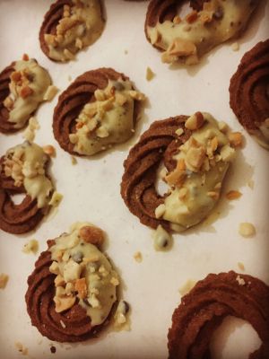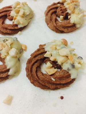 装饰部分:白巧克力融化 烤好的曲奇凉后站上白巧克力液 再撒上花生碎 花生碎是我用烤好的花生后装入袋中打碎