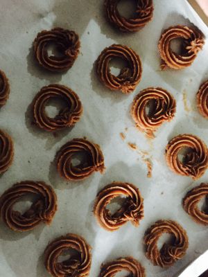 装入菊花嘴的裱花袋 冬天确实难挤很多 最好用布制的裱花袋 不然容易破 挤好后烤箱预热170 上下火 10分钟 烤25分钟左右出锅