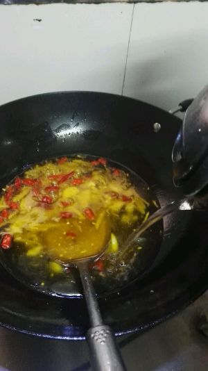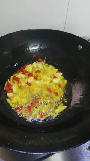 锅里多放些油烧热,再放入姜,小辣椒,一半以上的蒜煸香