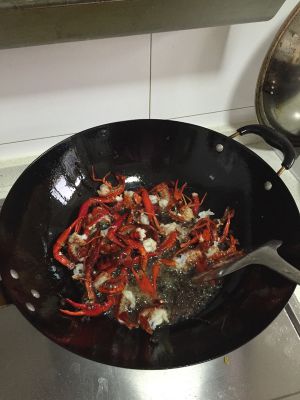 把先前煸好的小龙虾放入,加入第一步中糖醋调味料,一起炒。