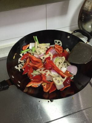 放入配菜炒至5分熟。