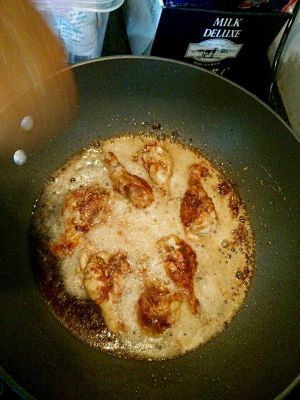 煎到出油后,将鸡腿拨到锅的一边,放入蒜末和姜丝在锅的另一边炒香,然后混合瞎炒… 一会后,放入少量耗油,生抽大火翻炒。将二十分钟前腌制腿腿的酱料倒进去,继续翻炒。 放入一点点老抽上色 ! 倒入一半可乐,淹没鸡腿就好。另一半喝掉! 然后大火煮…煮…煮!煮开后,调到小火慢慢煮…