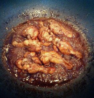 炒到鸡的香味出来改中小火,盖锅盖焖十多分钟,可乐的酱汁已经缩少粘稠,然后加少量盐,鸡精,出锅啦