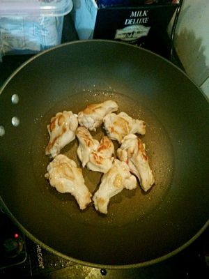 锅中倒入油,放入姜和蒜煸炒,然后倒入沥干的鸡腿,翻炒一到两分钟,放入盐,调味料,酱油,翻炒,然后倒入可乐,盖上锅盖,大概十分钟。