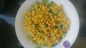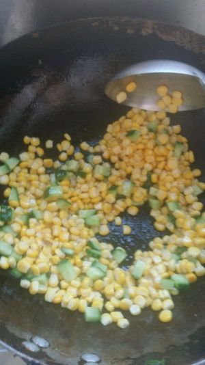 锅里放油,加入黄瓜丁,玉米。翻炒一分钟