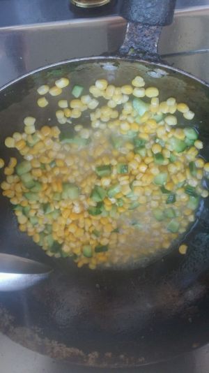 锅中再放底油,放入葱粒,青椒粒,炒出香味放入炸过的玉米粒和胡萝卜粒。