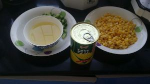 玉米盛出,玉米糖水备用(玉米罐头里的玉米比较甜可以少放糖)黄瓜切丁