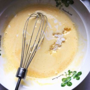 一袋200克的牛奶全部倒入蛋液里,混合搅拌