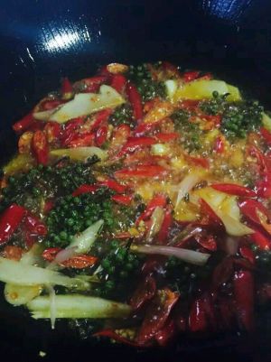 锅中放油(不减肥的朋友可以适当多放点更香)下入山奈、香叶、桂皮、干辣椒、藤椒、姜蒜碎煸炒出香味