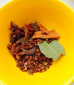 开火,放油,待油温热了以后,放入小茴香、花椒、香叶、丁香、八角、桂皮,翻炒。然后放入郫县豆瓣酱,翻炒至红油炸出。