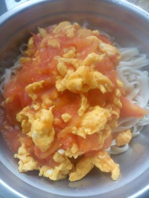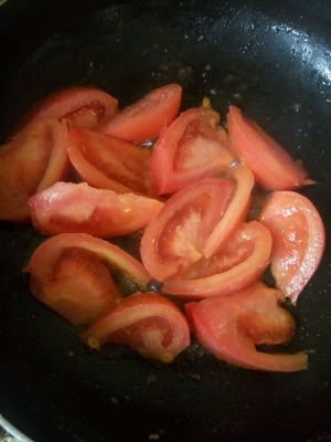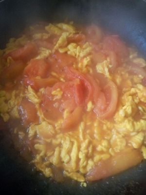 等西红柿软了之后加入鸡蛋翻炒一下,加了一点水,煮一下,落盐鸡精少许,最后我加了几滴醋
