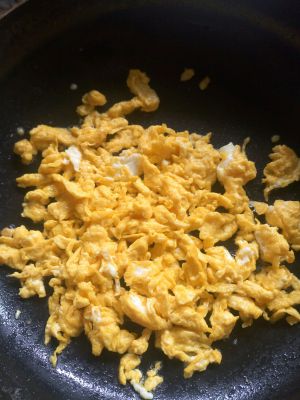 锅里放少许油,油热后把打好的鸡蛋放里面炒,七分熟后铲出。