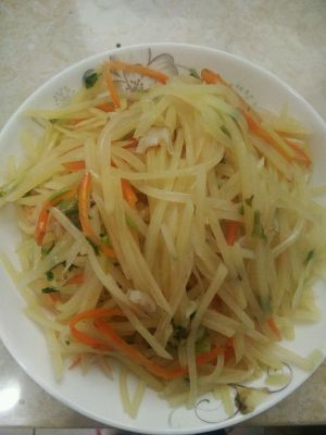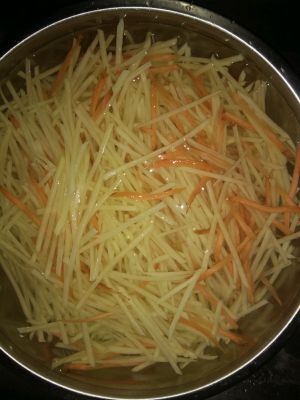 多功能刀非常方便,一会功夫就好了,把土豆和胡萝卜擦成丝,洗去淀粉,备用。