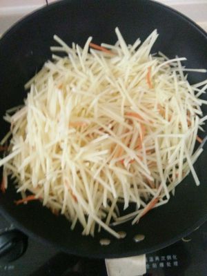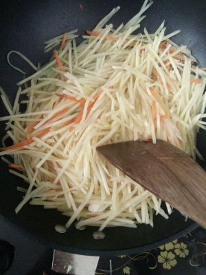 辣椒香味出来后放入过水洗净控干的土豆丝,喷醋翻炒到出现金色时放生抽上色,然后放盐和糖继续翻炒,快全熟时再次喷醋。