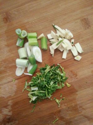 在小碗中加入同等比例的糖和醋,(今天用的是各4匙)再加入盐和少许的清水,调成料汁。同时将葱和姜都切成末,备用