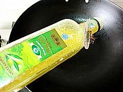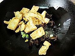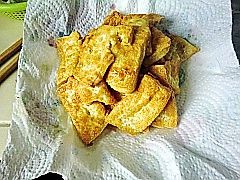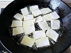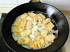 炒锅加油,油量不用很多。油稍热放入豆腐片,小火煎,一面煎黄后,翻面,煎至两面金黄后捞出