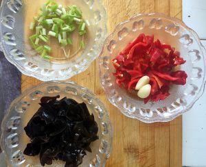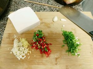 准备配料,本来应该是小葱,买菜时忘记了就用家里剩下的蒜苗代替