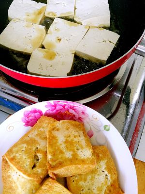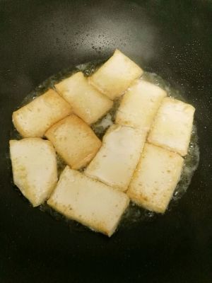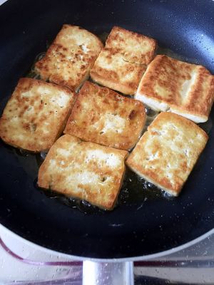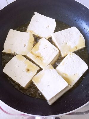 锅内少许油 放豆腐中火煎 此过程会稍微久一些 先调一个汁儿 (1.5勺酱油➕1勺蚝油➕1勺盐➕1勺糖➕0.5勺鸡精)