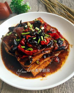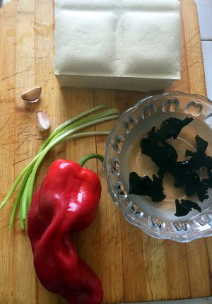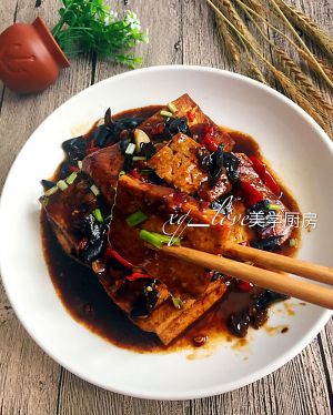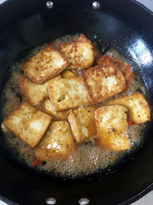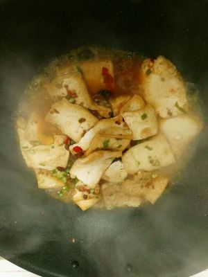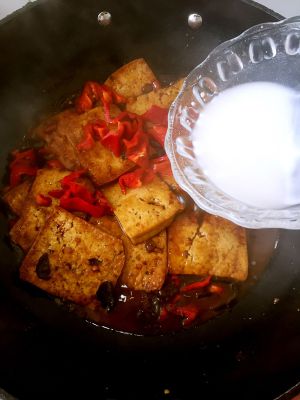 放入蒜片和炸好的豆腐,加入盐,酱油,糖,干辣椒,泡发的木耳翻炒,让豆腐上色。加入清水淹没豆腐转小火炖。