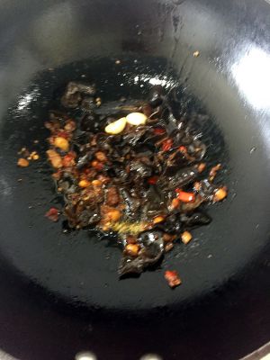 锅里加入木耳,到点水炒,不然木耳会炸的到处都是