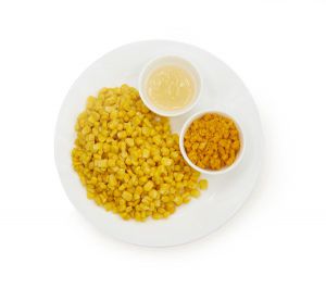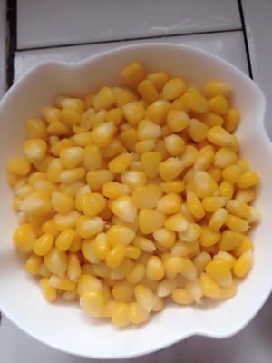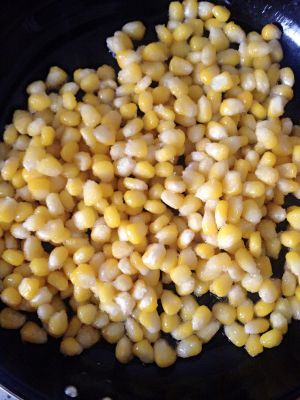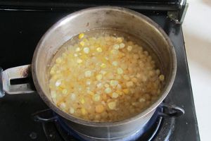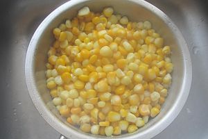 烧锅开水, 加入适量的盐, 下入玉米粒焯熟后捞出;