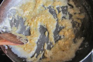 在锅中加入少量油,将碾碎的盐蛋黄放入炒制,微火慢慢炒咸蛋黄, 直到盐蛋黄全部成粉末的沙状;