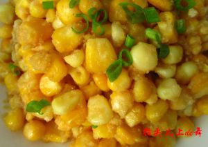 把蛋黄放入锅里煎下在放入炸好的玉米,反炒均匀放入白糖,起锅放入葱花即可