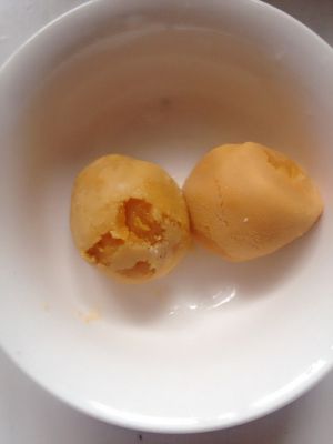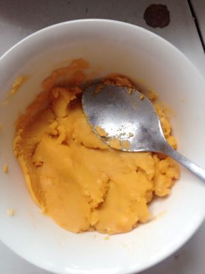将煮熟的盐蛋黄剥开, 用勺按压, 直至粉碎;