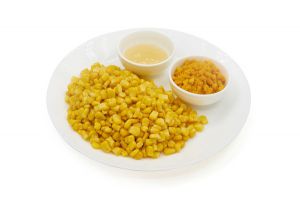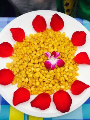 适量的油烧热至7成,将裹好的红薯粉倒入油锅煎至金黄,再将玉米乘盘待用。