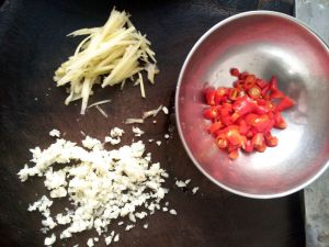 橘子皮洗净切丝,蒜瓣切末,小葱切末