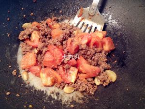 番茄下锅炒烂然后加番茄酱,番茄酱一定要加哦,加入少许糖调味,加点盐,炒匀然后加入大葱大蒜生姜继续翻炒,等到大葱软了加水
