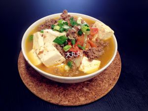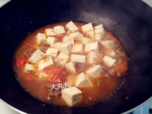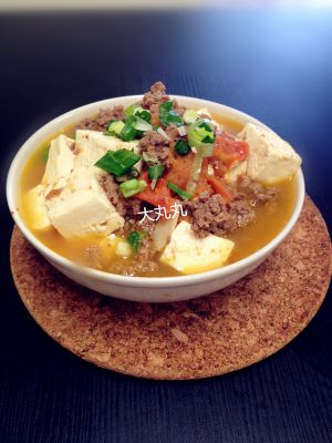 倒入清水没过肉末与番茄,水开后下入豆腐,调入盐,炖煮至汤汁收浓即可出锅,出锅后撒上葱花。