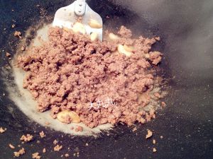 起油锅,炒香蒜片后下入牛肉末炒至肉末8成熟。