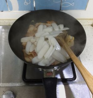 放入年糕一起干炒一会,放入一勺韩国辣酱,炒至年糕裹上红色辣酱。