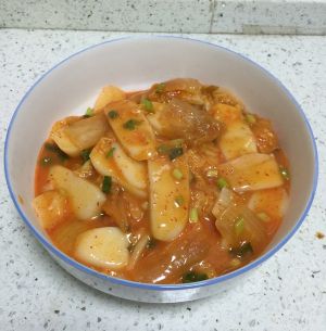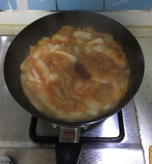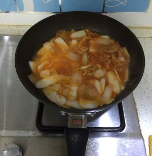 倒入年糕继续翻炒,加入少量水,盖上锅盖焖煮一会儿。口味重的可以根据自己口味加入少量番茄酱或者白糖。我买的辣白菜味道刚刚好,我就只加入少许盐。待锅内汤汁粘稠,年糕变软,即可出锅。