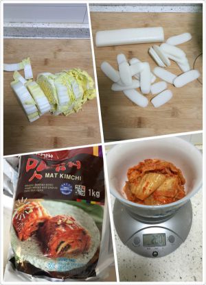 年糕用手掰成小块,用冷水泡一下。辣白菜切段,四川麻辣香肠切片